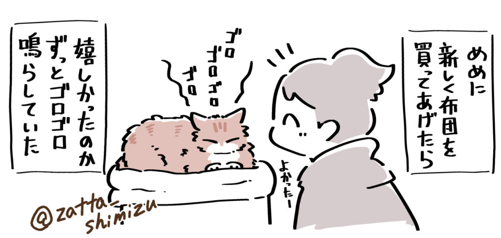 めめちゃんが私の夏の掛け布団に対して『これ気持ちいいですね、良いですね』って感じで寝ていたことがあったので、同じ掛け布団を買ってプレゼントしたら喜んでゴロゴロ喉を鳴らしていたので、猫ってこういう事でも嬉しい(気持ちいい?)って喉鳴らすんだなぁ、って思ったので兄弟にも喉を鳴らしてもらいました😌